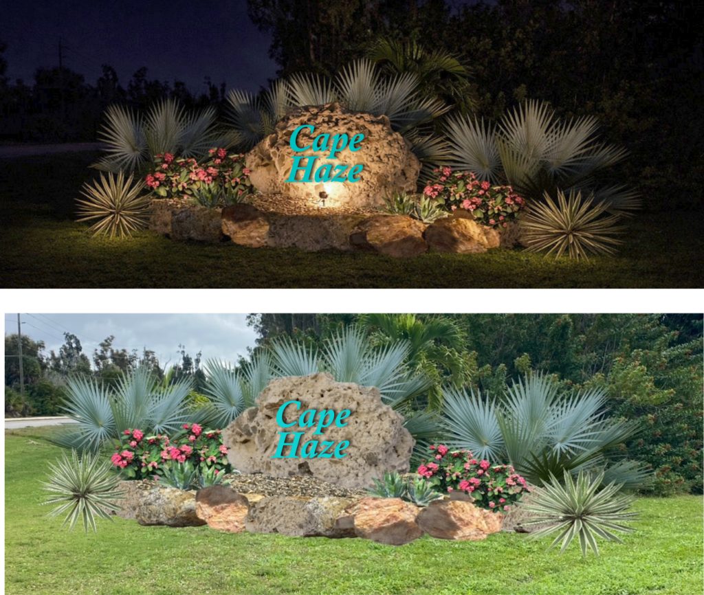 Currently, we’re fundraising in the community to revamp our north and south entrances. We need your contribution Cape Hazers. These entrances are important to Cape Haze, and are in need of serious attention – please consider donating. Our goal is to have all funds by March 15, 2026 with work completed by mid-April 2026. The new designs will make a significant impact in so many ways.